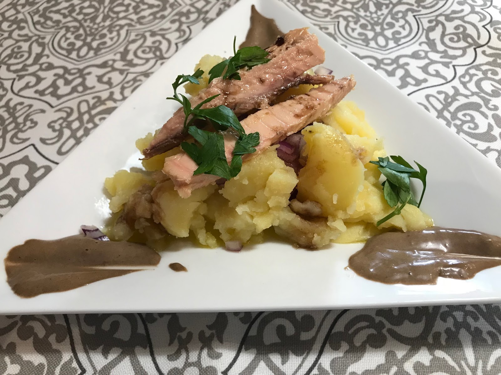 Patatas aliñadas estilo Sanlucar con alioli de ajo negro